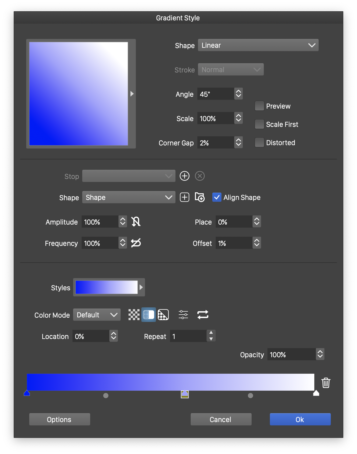 - Offset - Edit the gradient shape offset, perpendicular to the linear gradient axis.