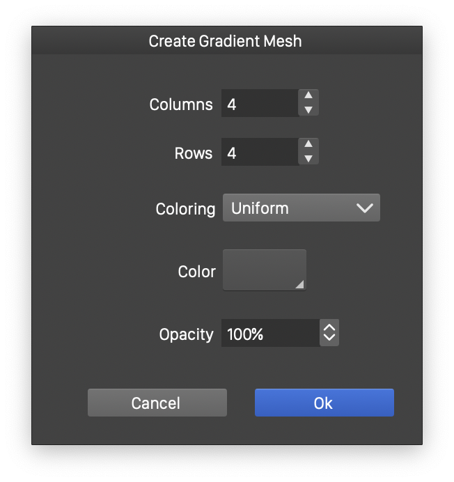 - Set the initial color of the mesh nodes in the Color field. The mesh nodes are colored using the current object color and the selected color, either by using the same color (Uniform), or transitioning between the object color and the selected color towards center (To Center) or towards the object edges (To Edge).