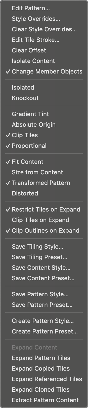 The pattern panel menu contains additional commands and options used to adjust the tiling pattern style. It also provides access to commands to create new pattern content styles and presets, and to create and select pattern styles and presets.