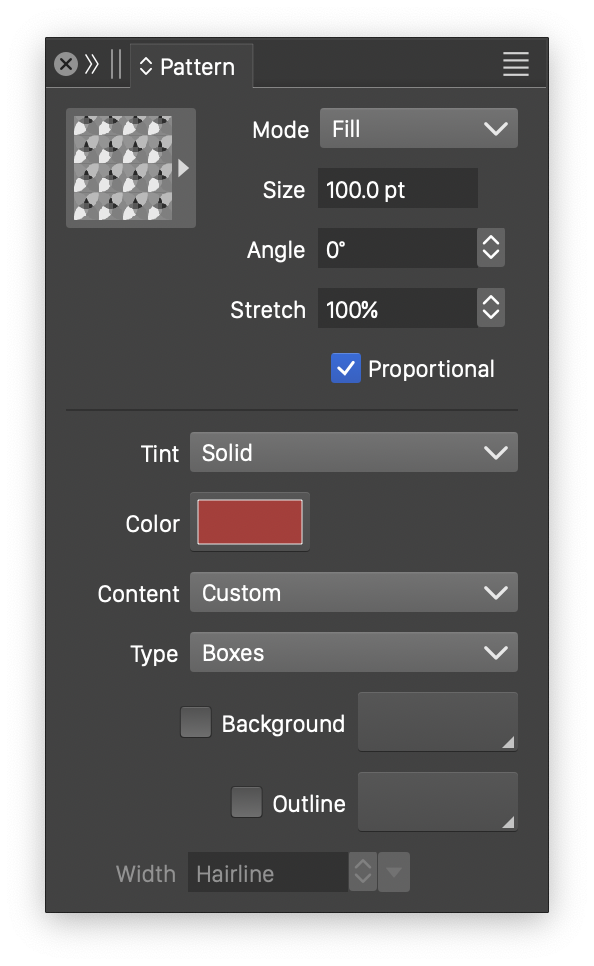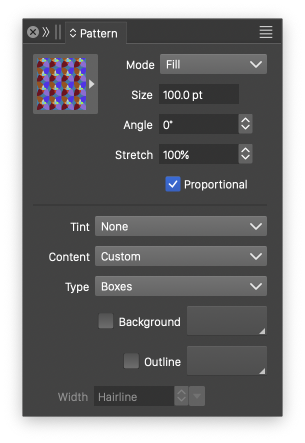 - Type - Opens a list of pattern tiling modes. The tiling mode determines the location of pattern tiles relative to each other. The available tiling modes are Boxes (for rectangular tiles), Hexagons (for hexagonal tiles), Triangular (for triangular tiles), Rhomboid (for rhomboid tiles). The tiling mode determines the tiling options available in the bottom section of the panel.