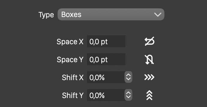 When the Boxes tiling mode is selected, the pattern content is arranged into a rectangular grid using the size, scale and angle options of the pattern. The rectangular grid can also set a spacing amount between the grid cells, and a shift in horizontal or vertical direction.