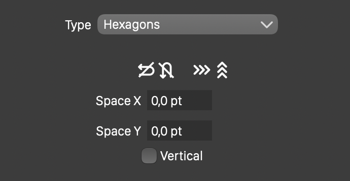 The Hexagons tiling mode arranges the tiles of the pattern in a hexagonal grid, using the size, scale and angle options of the pattern. The hexagonal grid tiling allows spacing between the tiles and the control of the tiling direction.