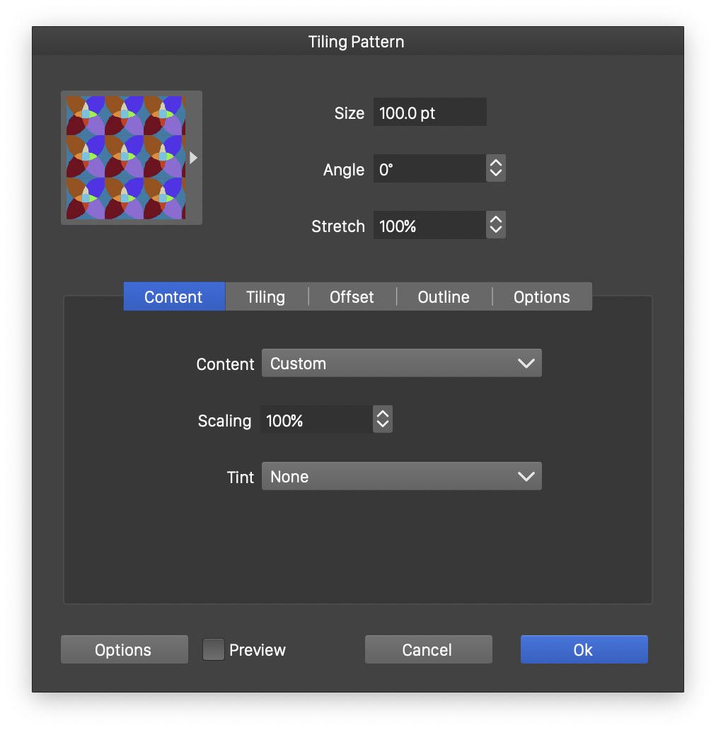 - Preview - Enable or disable the previewing of the current pattern options on the selected object.