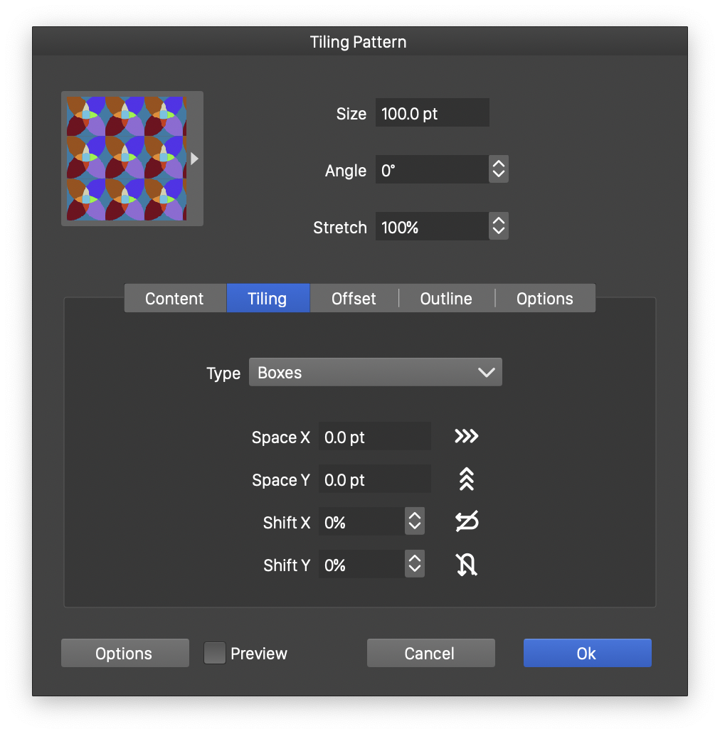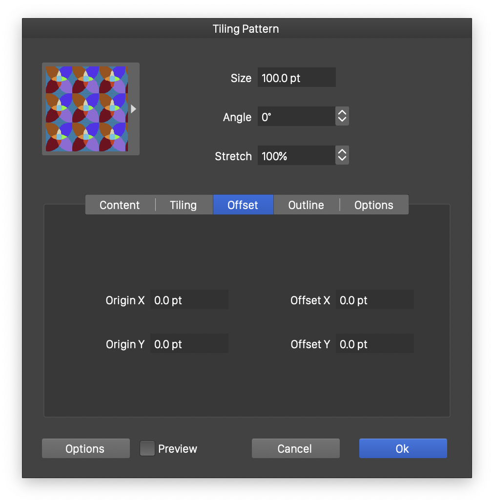 - Offset X and Offset Y - Edit the additional offset of the pattern tiles, relative to the pattern origin.