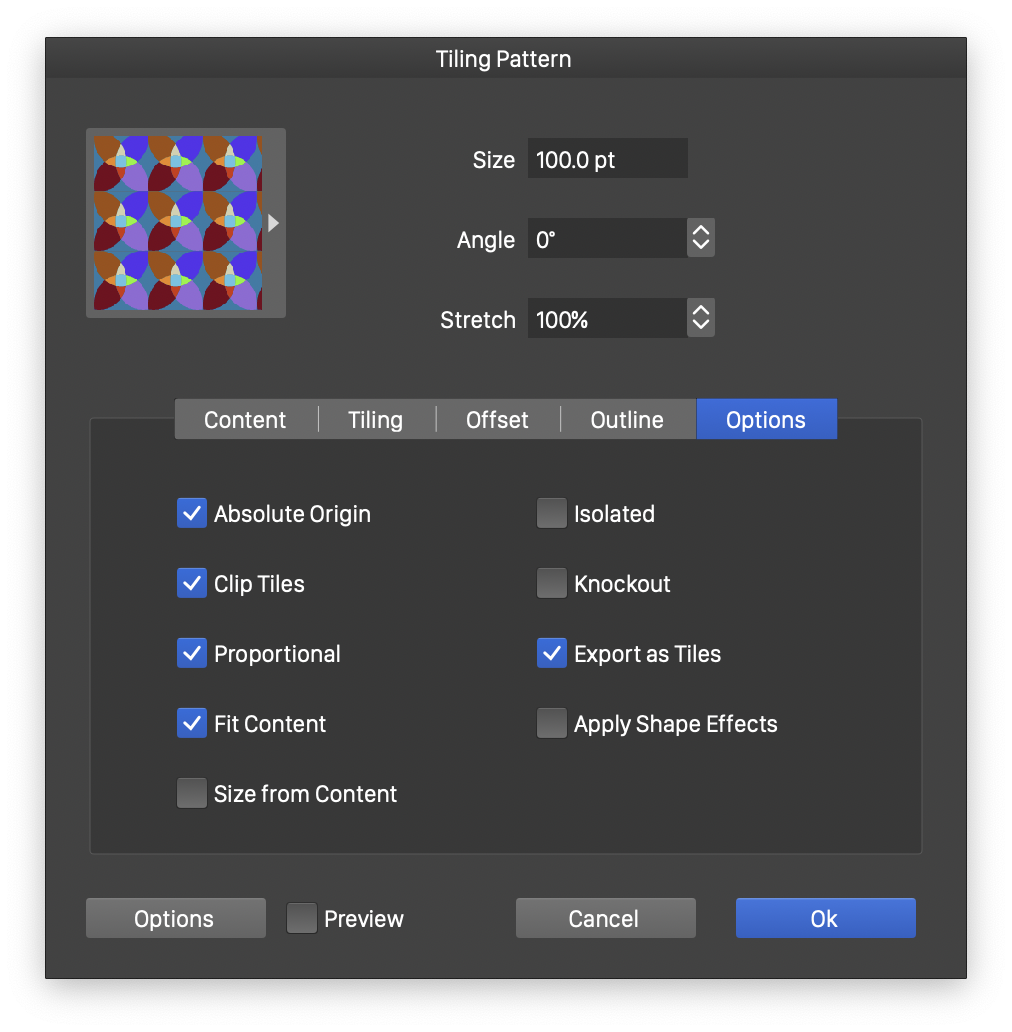 - Knockout - Enable or disable the rendering of pattern content as a knockout group. This option determines how opacities and blending modes of a pattern content object are rendered.