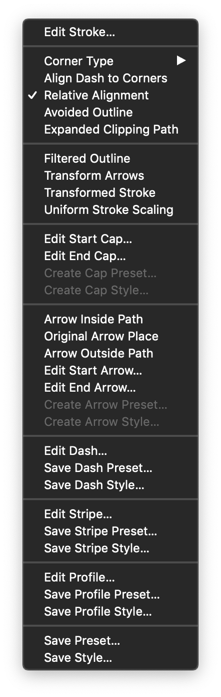 - Save Preset - Create a new preset from the current stroke attributes. Stroke presets can be applied to objects from the Presets panel.