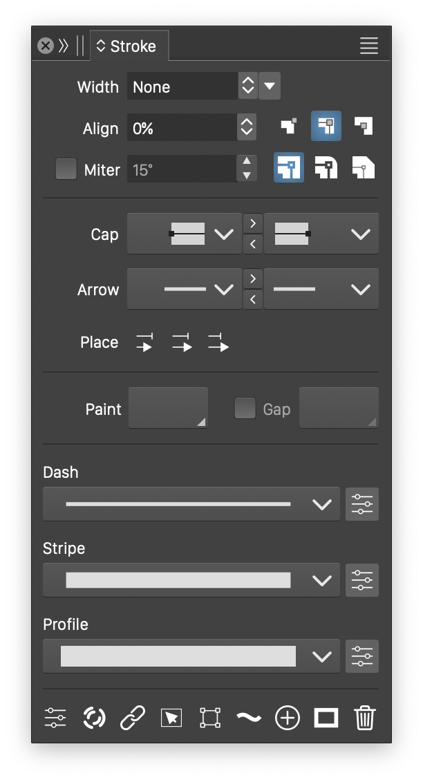 button. The list of predefined stroke widths can be modified in the application settings Size Amounts section. Setting the stroke width to 0 (or Hairline), will set it to the thinnest possible width at any resolution and zoom. - Align - Set the stroke alignment relative to the actual outline shape. The alignment can be set to relative (to the width) or absolute amounts. The mode of setting the alignment can be selected from the panel menu. A set of three predefined stroke alignments can be selected using the buttons next to the Align field, these can be: Inner