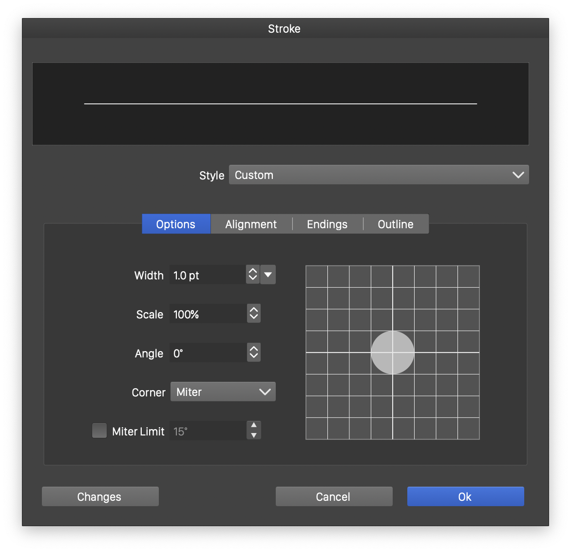 The top of the stroke selector view contains a preview of the current stroke attributes. The stroke selector view is organized into four sections to edit the stroke attributes and the style and changes options: