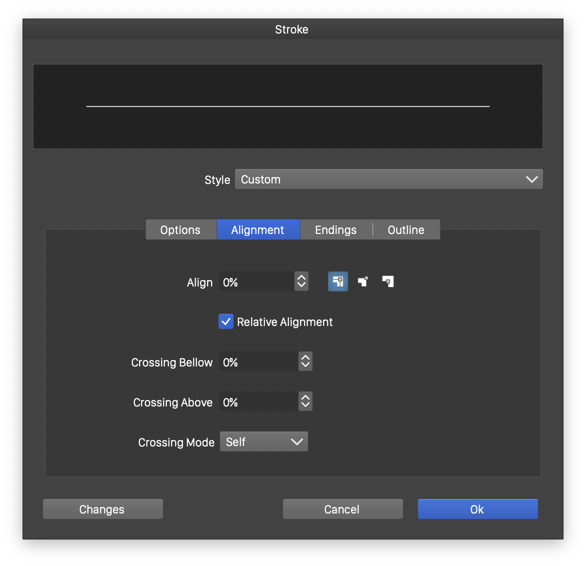 - Align - Edit the relative or absolute stroke offset from the object outline. Relative offsets are set in percentages relative to the stroke width. Absolute offsets are set as an absolute distance of the stroke center from the object outline.