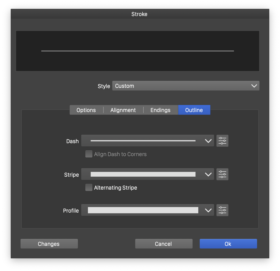The stroke selector view contains all the attributes used to render an object outline with a stroke style. The stroke selector view can be opened with the stroke panel menu Edit Stroke command, or when editing a stroke preset or style in the Presets or Styles panel.