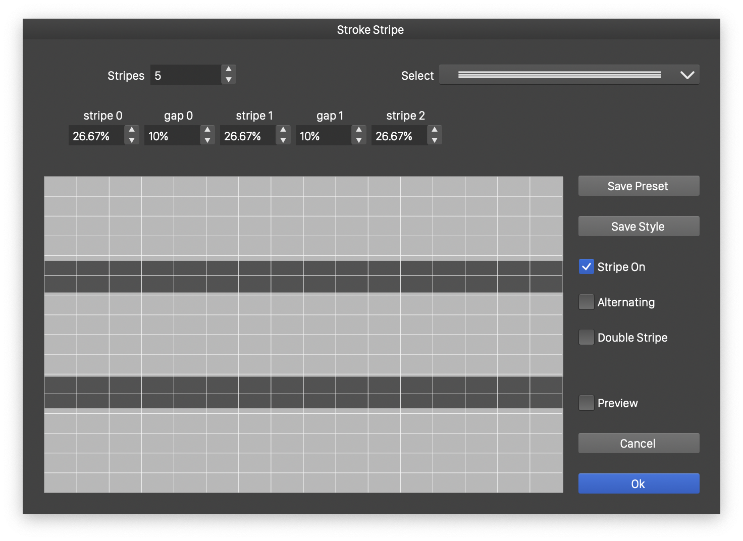 - Stripe On - Set the first stripe to be filled or left empty. When checked, the first stripe is filled. If unchecked, the first stripe is a gap.