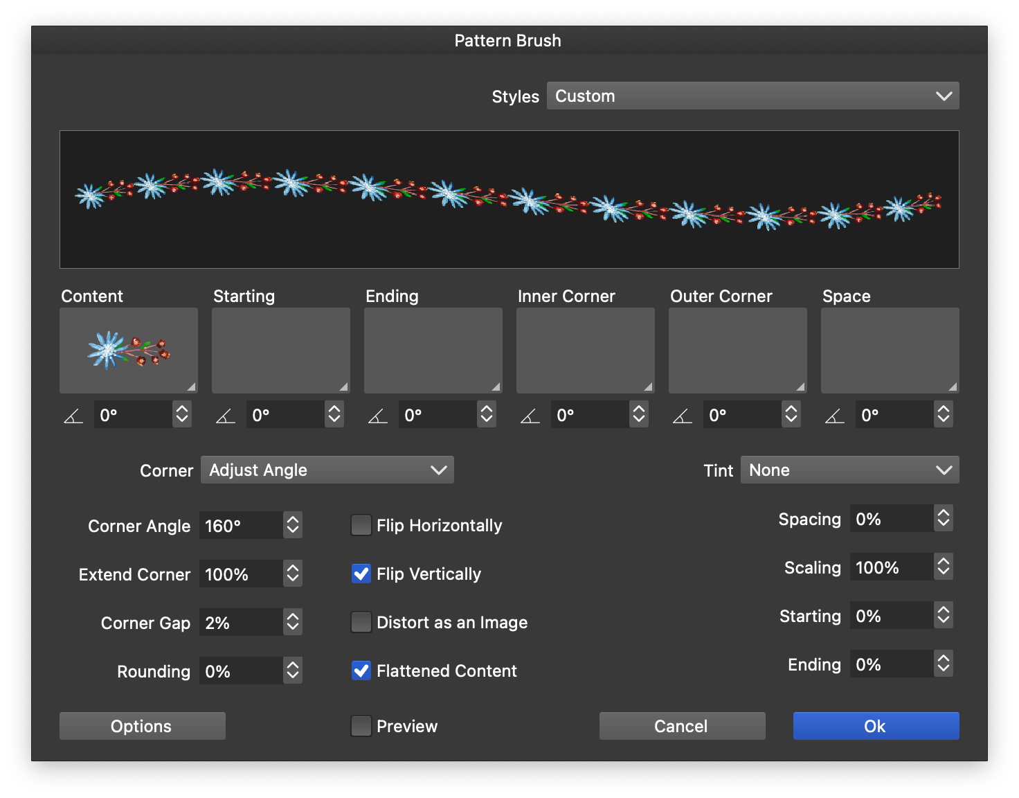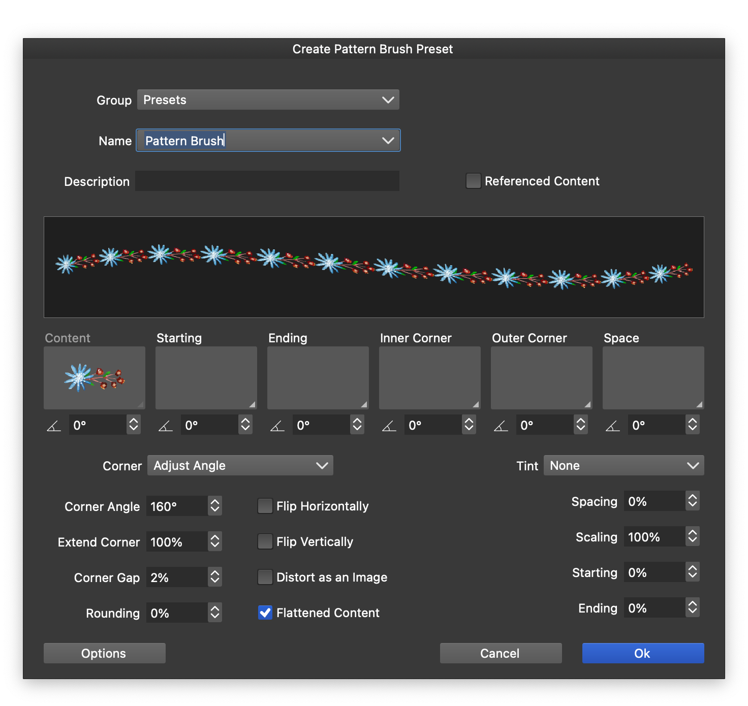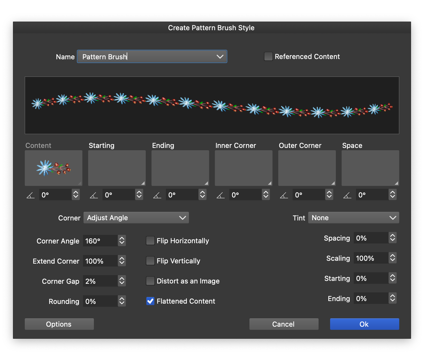 - Referenced Content - Enable or disable the use of object referencing for the pattern brush content. When enabled, the pattern brush style will keep a link to the original objects. Editing the original objects, used as pattern brush content, updates all pattern brushes using the brush style.