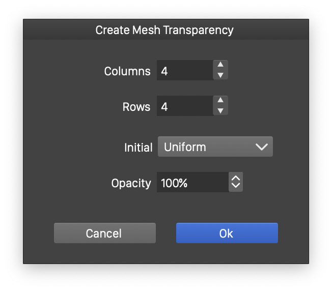The transparency of an object or group of objects can be set using a gradient mesh of opacity values, in a similar way as gradient mesh objects are edited. The mesh transparency mask enables the selection of different opacity values, at different locations over the object area, and a smooth transition between these opacity values.