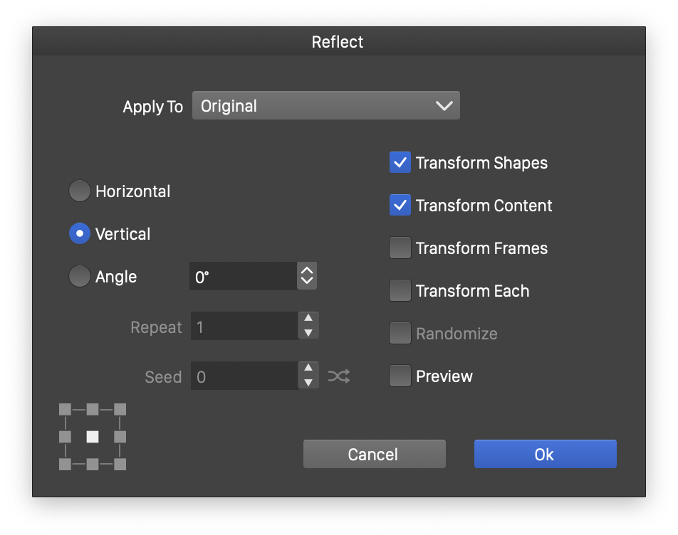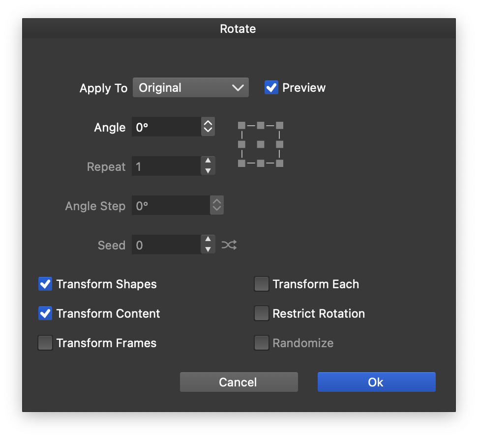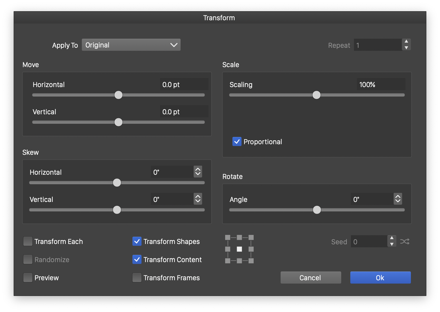 In some cases (after several transformations), it is preferred to apply a new transform (scaling, skewing or rotating) to the object without considering existing transformations. This can be done using the Reset Transform command of the Object - Transform menu. The Reset Transform command will reset the bounding box into a non-transformed frame, so that new transformations can be added to the object.