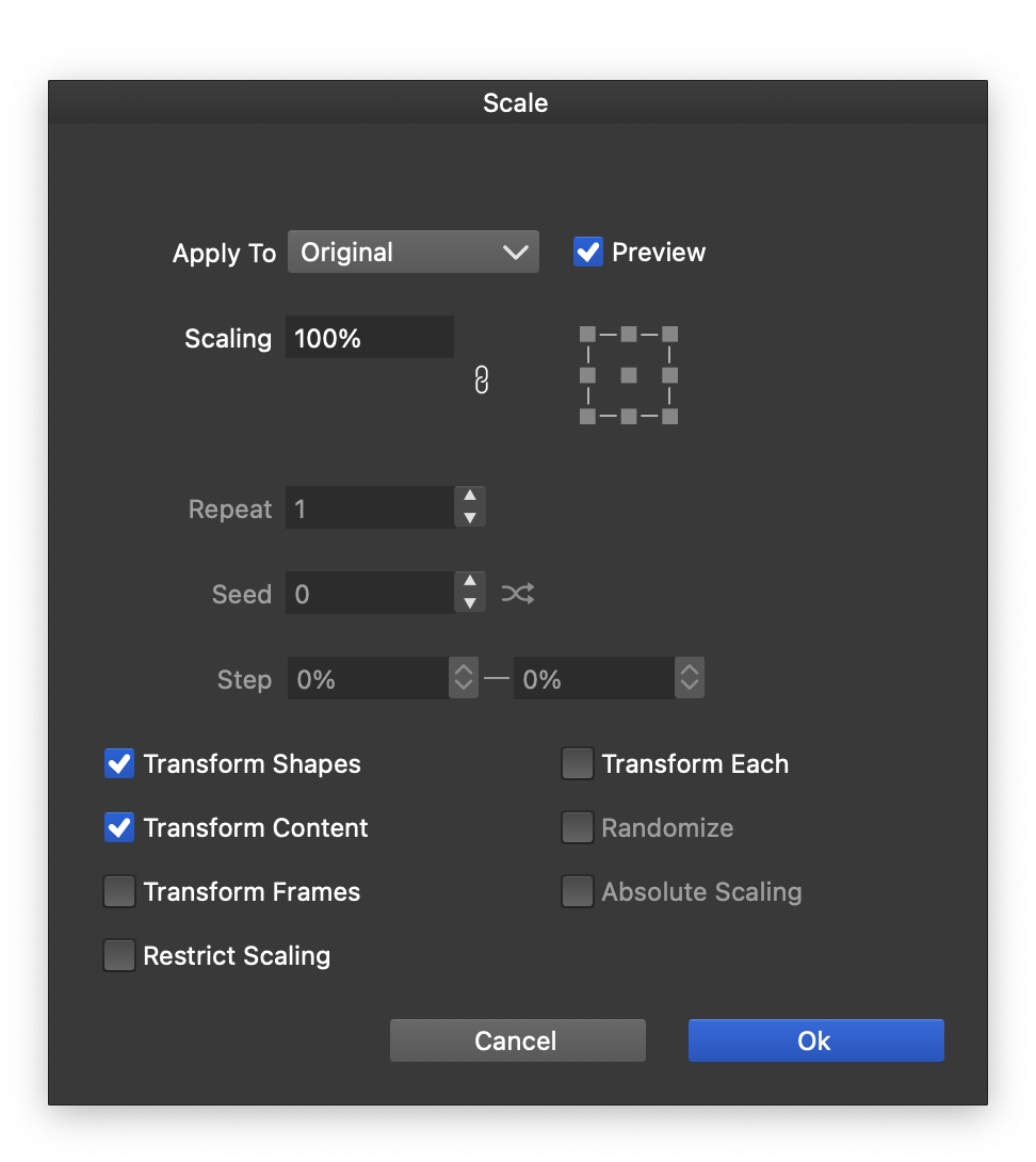 - Preview - Enable the previewing of the current scaling options on the selected objects.
