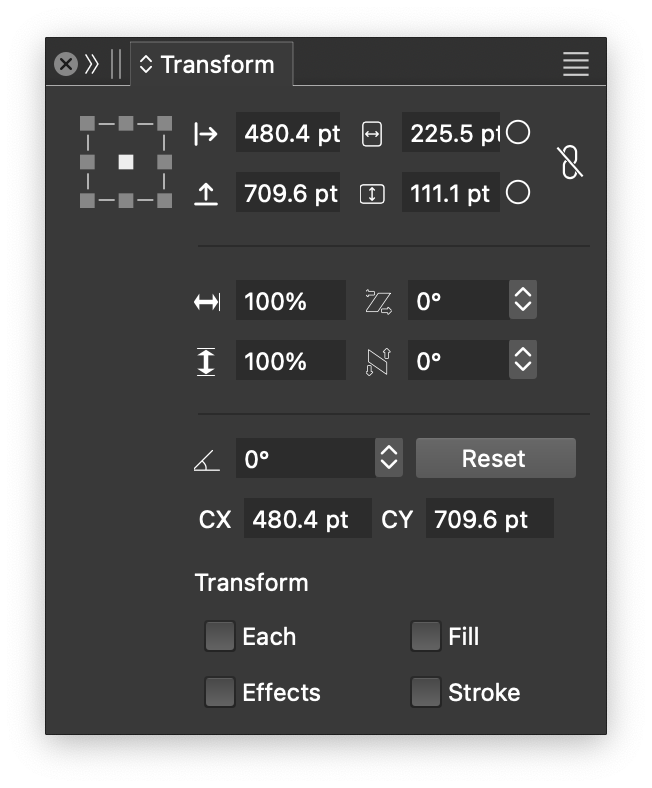 - The transform pivot center can be edited as numbers by one of these pane states, when the CX and CY fields are shown.