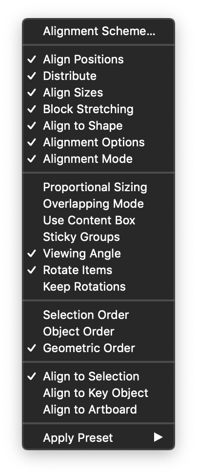 - Align Sizes - Show or hide the Align Size section of the Alignment panel.