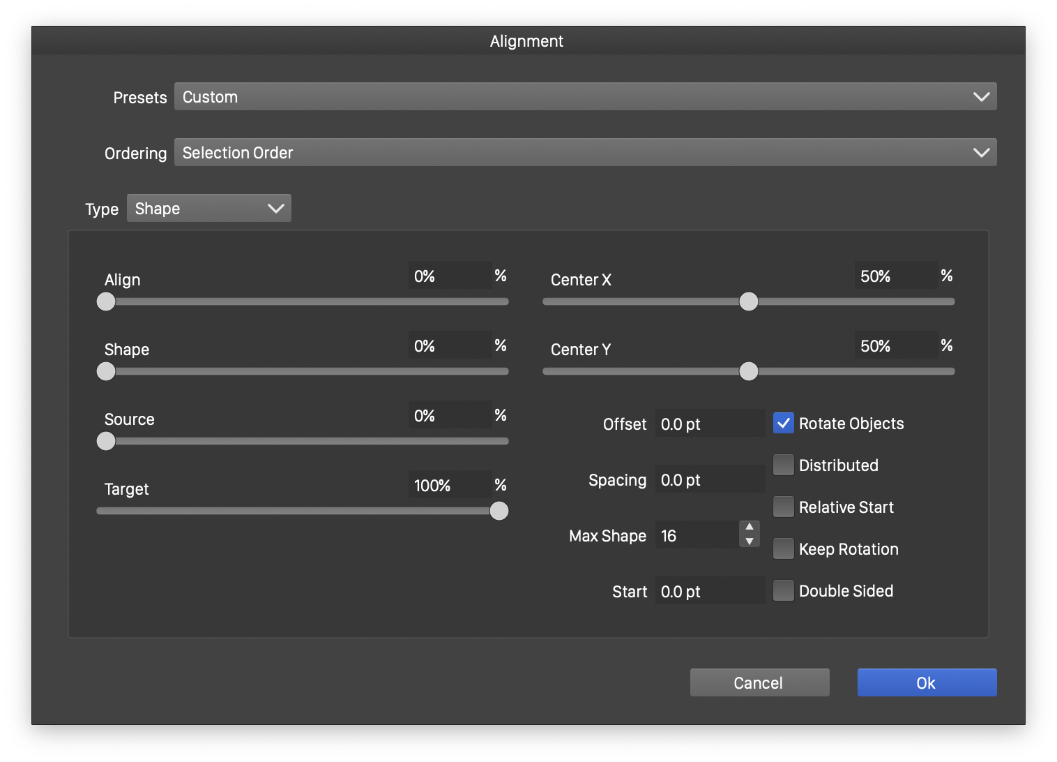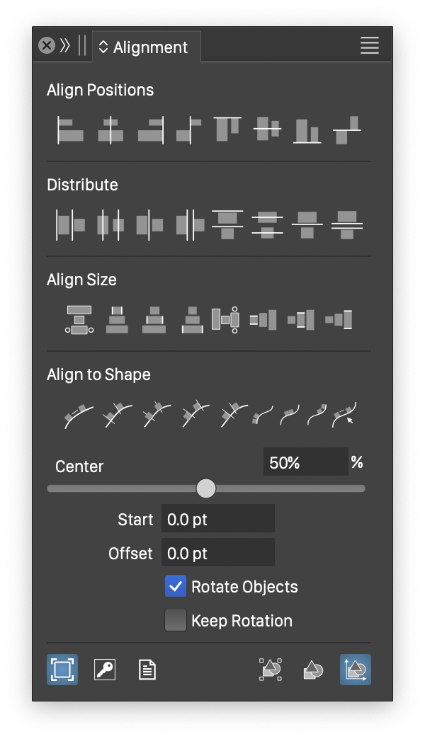 tool from the Alignment panel. - Rotate Objects - Enable or disable the rotation of objects to the shape direction.