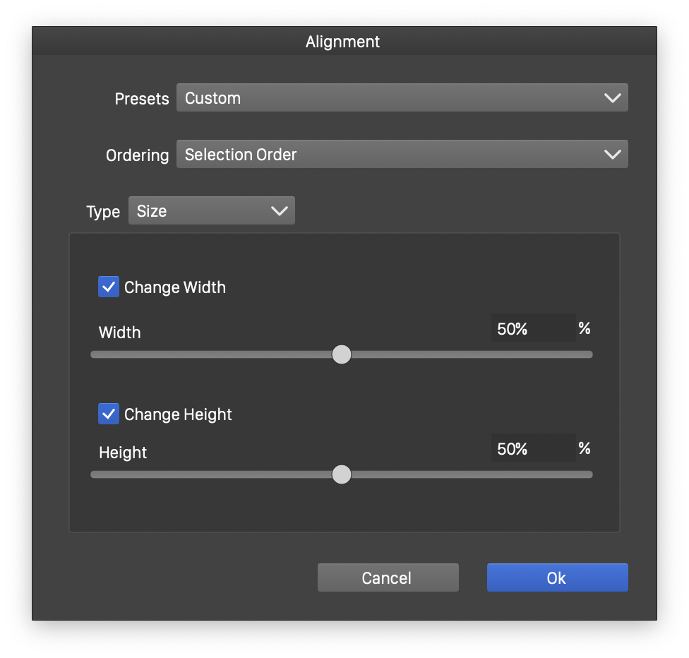 The selected objects can be resized to the same size in a selected direction, using the object size alignment options. The resulting object size can be the smallest, medium, largest size, or the size of a key object from the selection. The object size alignment options can be found in the Align Size section (third row) of the Alignment panel. The following size alignment options are available: