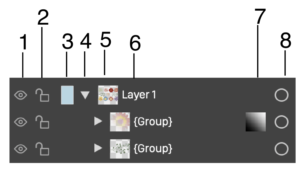 A layers panel item, as seen in the figure, contains the following visual elements: