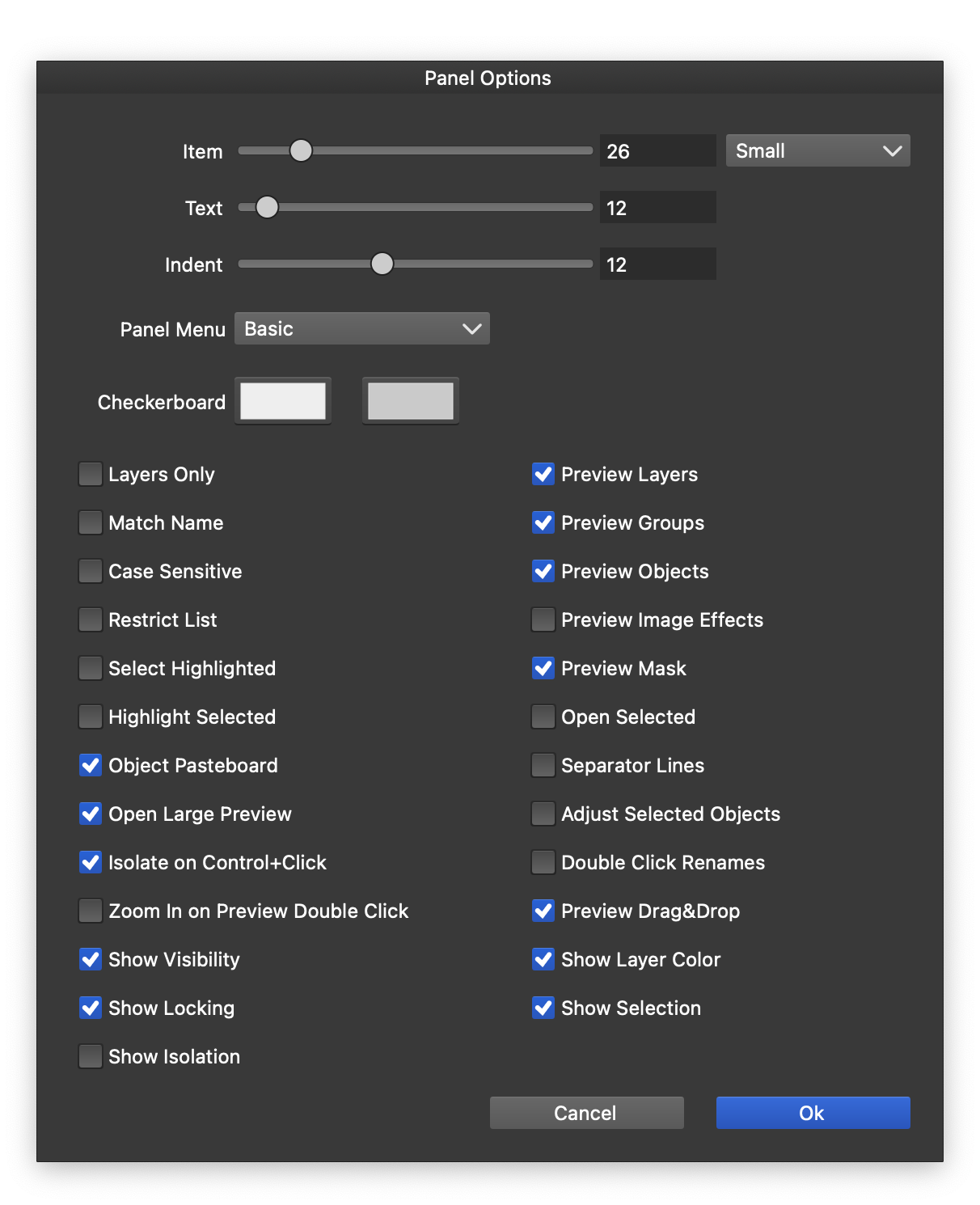 Various aspects of the Layers panel can be configured, using the Panel Options command from the panel menu. Configuring the layers panel includes setting the list item sizes, enabling or disabling previews and setting highlight and search options.