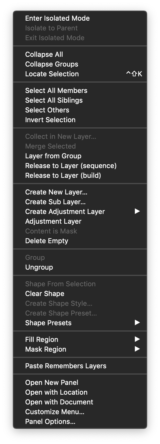 The Layers panel menu contains various commands, that can be used to manage or modify selected objects in the panel. The following commands are accessible from the Layers panel menu: