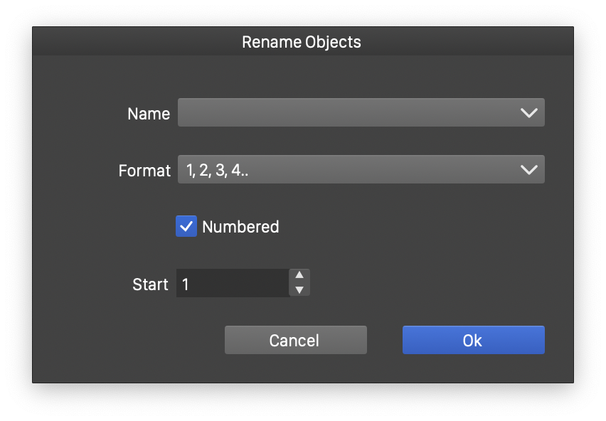 Naming a large number of objects can be a difficult task, as it may require editing individual object names. In VectorStyler, multiple objects can be renamed to synthetic names, using a selected numbering scheme. This allows the naming of a large number of objects with similar yet different names. Later, the name similarity can be used to find and select these objects.