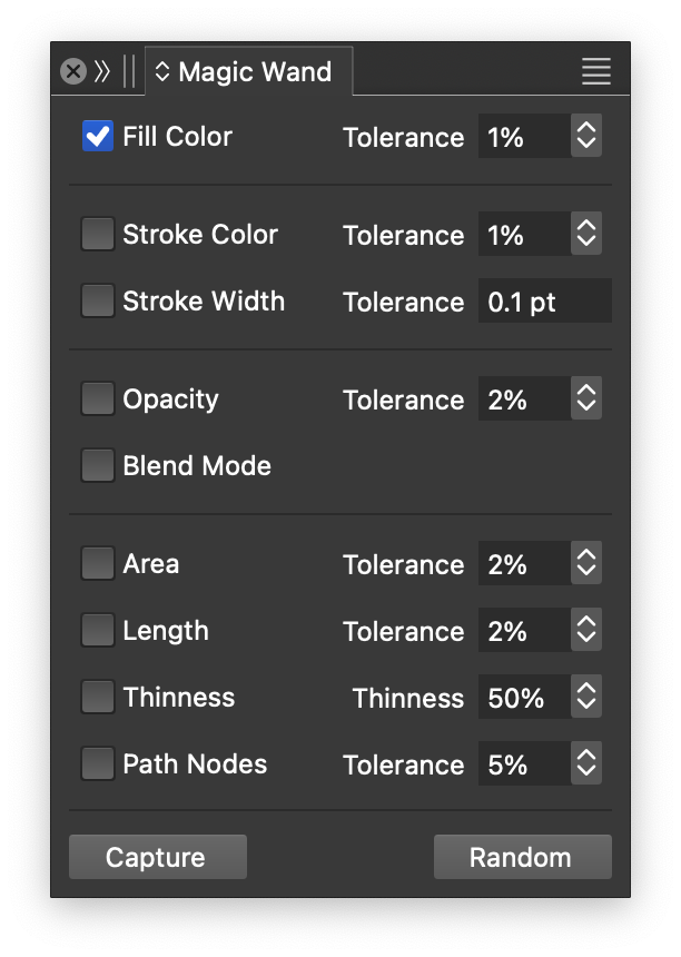 The Magic Wand panel can be opened from the Window - Editing menu. The panel contains attribute selection options, used when searching for objects with similar attributes while selecting with the Magic Wand tool. Enable object attributes that are used in the search, by checking the corresponding check boxes. The attribute matching tolerance, if applicable, can be set in the numeric field next to the attribute.