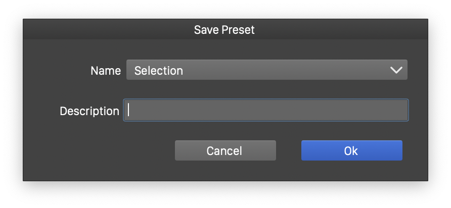 - Create Selection - Create a new selection preset from the current selection in the canvas. The Save Preset view is shown to set the new preset name and description. This command is the same as the one accessed using the