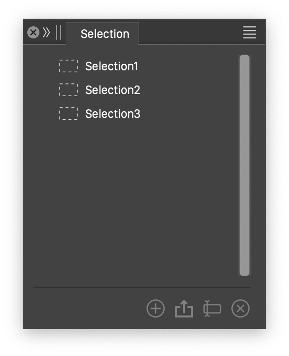 The Selection panel, opened from the Window - Editing menu, is used to recall and manage the selection presets available in the current document. The selection panel contains the list of selection presets, from the current document. To recall a previously saved selection preset, select the preset name in the panel. Selection presets can be created, recalled and removed using commands of the selection panel.