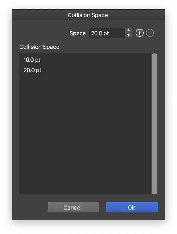 - To add a new collision space, click on the empty region of the list to remove the selection. Type the new spacing in the Space field, and click on the