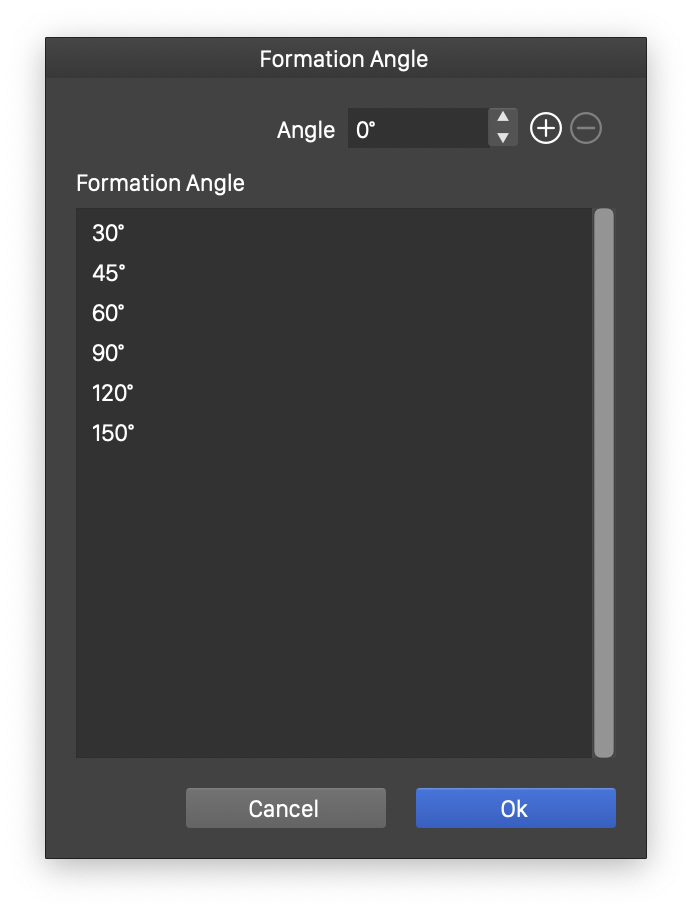 - To change an existing formation angle, select the value in the list and set the new value in the Angle field. The value is confirmed, by clicking away from the Angle field.