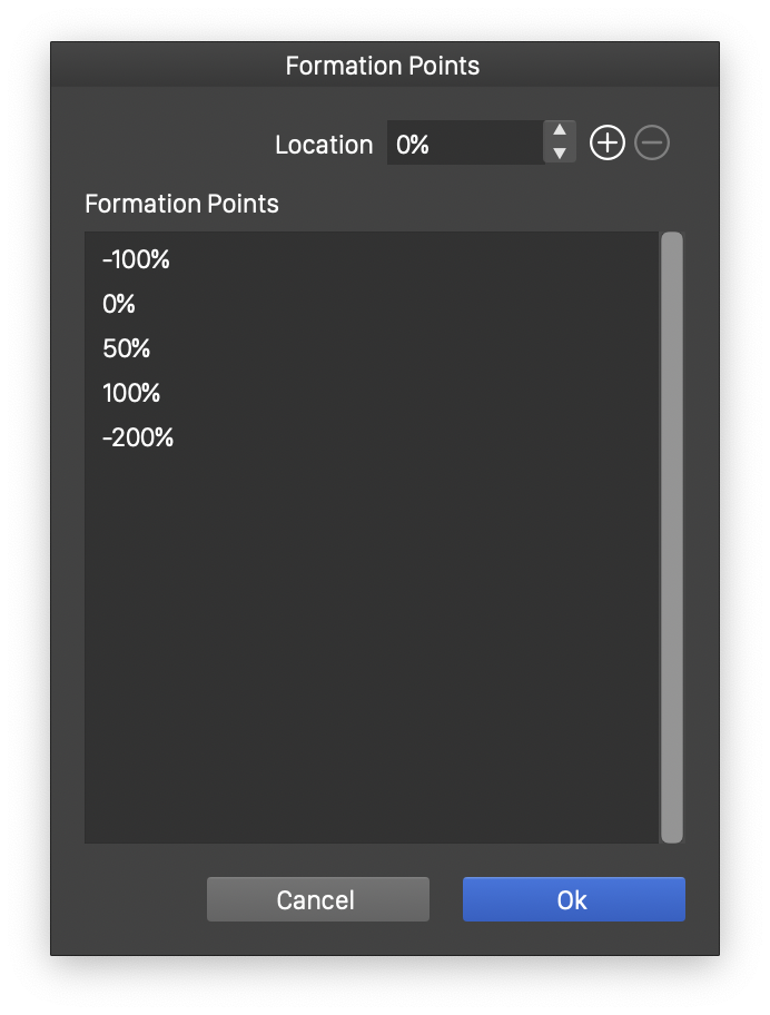 Formation locations are configured in a similar way as formation angles. The point locations along a line are defined relative to the distance between the two target objects forming a geometric formation with the moved object.