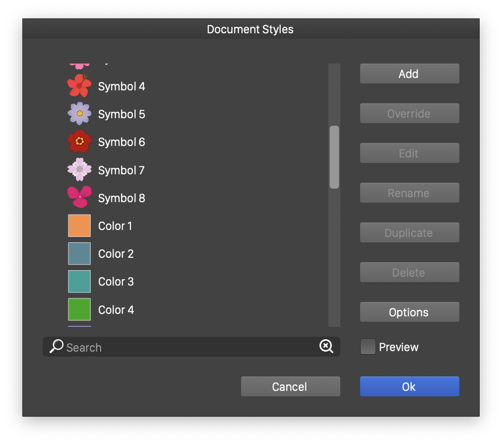 - The main area of the view contains the list of styles available in the document, canvas or object. The styles can be shown in a list or grid view, depending on selections made in the menu accessed using the Options button.