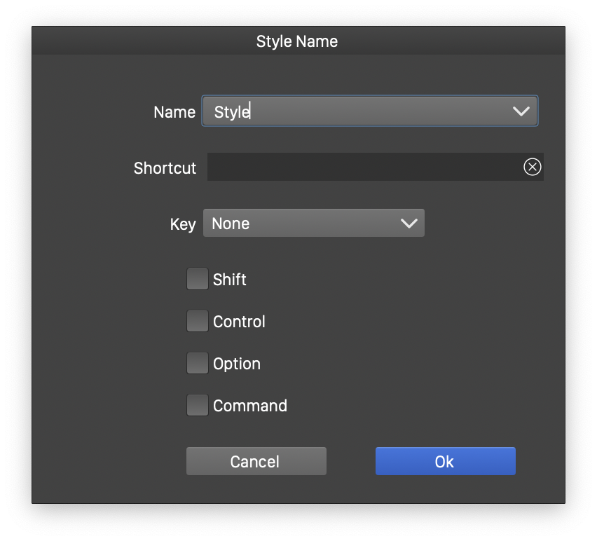 - Open the style name and shortcut editor. The style name is always required, and it is set in the Name field of the style name editor view. The style shortcut can be used to quickly apply the style on the selected object, assuming no other action uses this shortcut. The shortcut can be set in the Shortcut field, by pressing the key and Shift, Control, Option or Command modifiers. The shortcut can also be set by selecting the key from the Key field, and selecting the modifier keys using the check boxes.