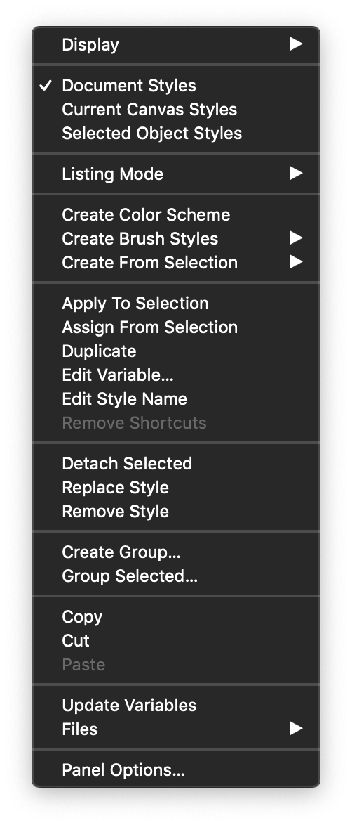 The Styles panel menu contains several commands that can be used to apply and organize the styles of the document. The styles of a document are not separated by type, and are stored in a single folder hierarchy inside the document.