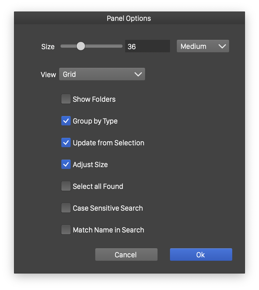 The styles panel uses a number of options to configure the appearance of the panel. The styles panel options can be edited using the Panel Options command from the panel menu.