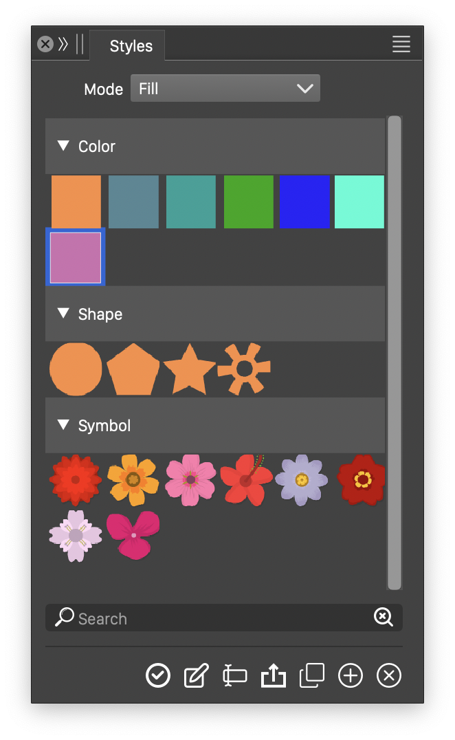 In VectorStyler, it is possible to create styles for colors, gradients, shapes, strokes, brushes and other attributes of objects. Symbols are also styles, reusing a whole object, by linking to a source object.