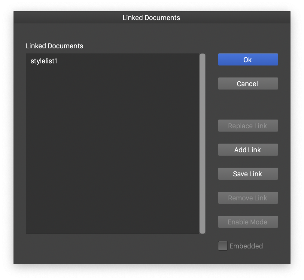 - Embedded - Enable or disable the embedding of the selected document. When enabled, the document will be included into the current document file, when the current document is saved. When disabled, the document is in a separate file and that file must be copied with the current document to avoid breaking links to styles.