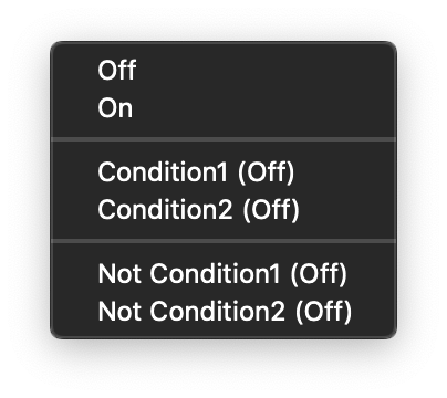Condition variables can also be used in dual choice (boolean) attributes that are typically selected as check boxes, or checkable menus. When selecting the attribute with a check box, Control + click on the check box to open a menu with a list of condition variable options. This menu contains the On and Off options, to set the attribute to a fixed on or off mode. The menu contains a list of condition variables and a list of options that negate these condition variables. Select these to set the boolean attribute to a condition variable, or a negated value of a condition variable.