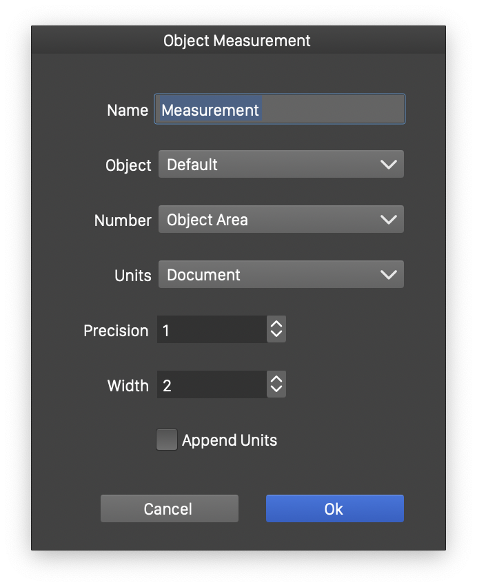 icon or select the Number from Object menu from the panel menu. The Object Measurement view is opened to setup the options of a measurement number variable, as follows: