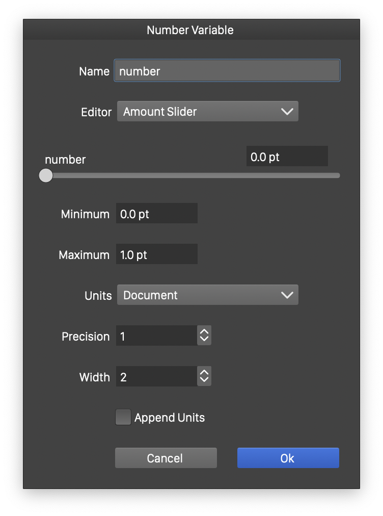 For example the stroke width can be set using a number variable, and the same number variable can be used to set the width of a blur effect. Number variables can be used to create configurable artwork, or as parameters of symbols.