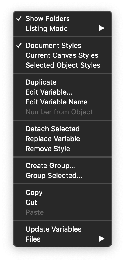 The variable values panel menu contains options used to manage the set of variable definitions. These are similar to the options available from the Styles panel, as variables and styles are the same concepts internally in VectorStyler.