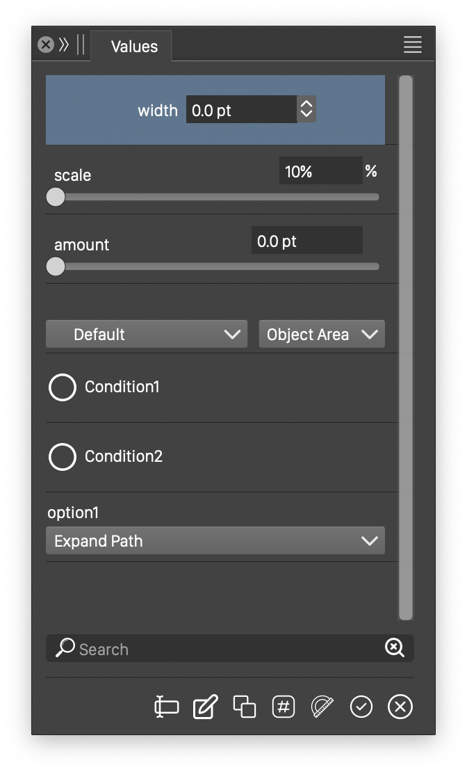 The variable values panel lists all the numbers, selectors and conditions defined in the current document. These can be edited or removed using the commands of the panel icon row, or the panel menu.