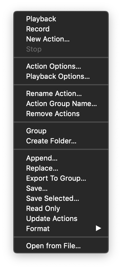 Just like any preset, actions can be organized into folders. Files containing actions can be imported and exported, using the selected file format. Action presets can be installed by opening the folder containing the preset file as a preset group.