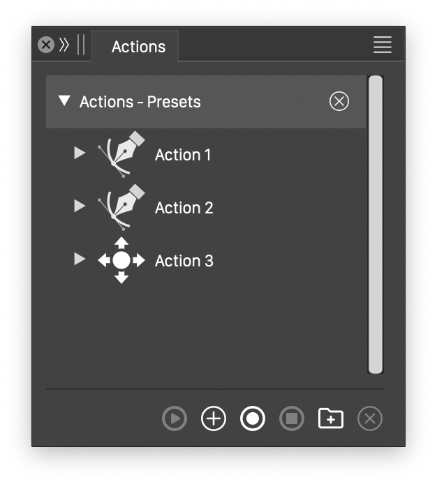 Actions are stored and managed as presets. This means that action recordings can be stored with the document, globally for the application, or in any active preset group. Actions in a preset group are stored in a separate preset file. Action files can be copied to other VectorStyler instances, and used as presets.