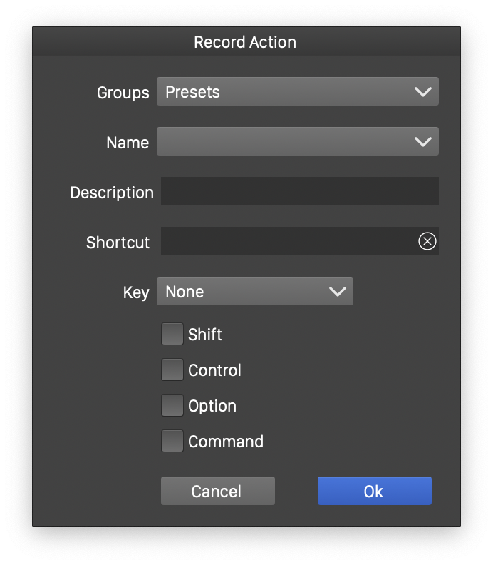 - Create a new action and start recording the action. A modal view is opened to set the preset group, action name and description, and the shortcut associated with the action.