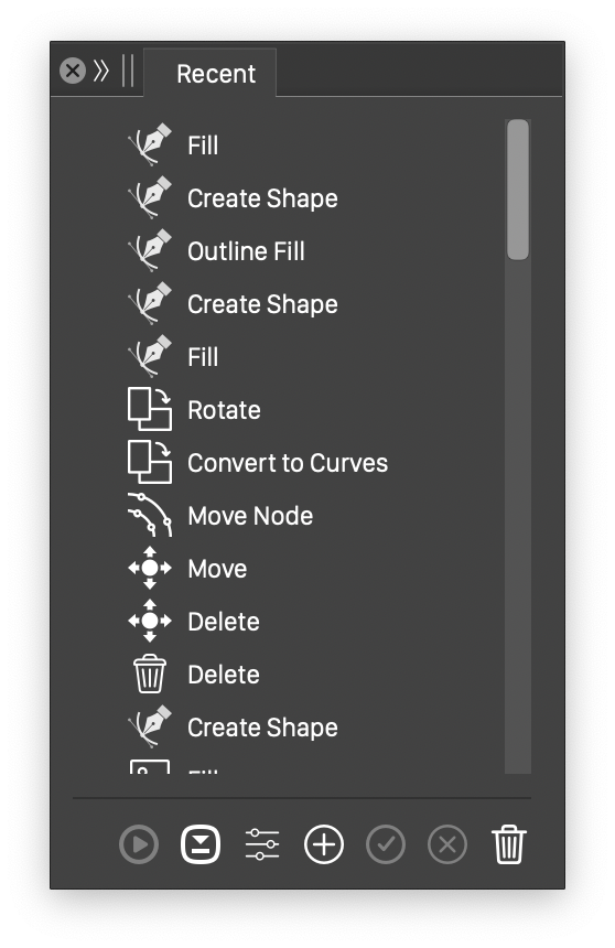 Any action, or command making a change on the selected objects, or in the document can be repeated on other selections or documents. A set of most recent commands and actions are recorded and kept in a separate recent actions preset file. This includes changes made from various panels of VectorStyler, commands selected from the menu, or actions played back from the Actions panel.