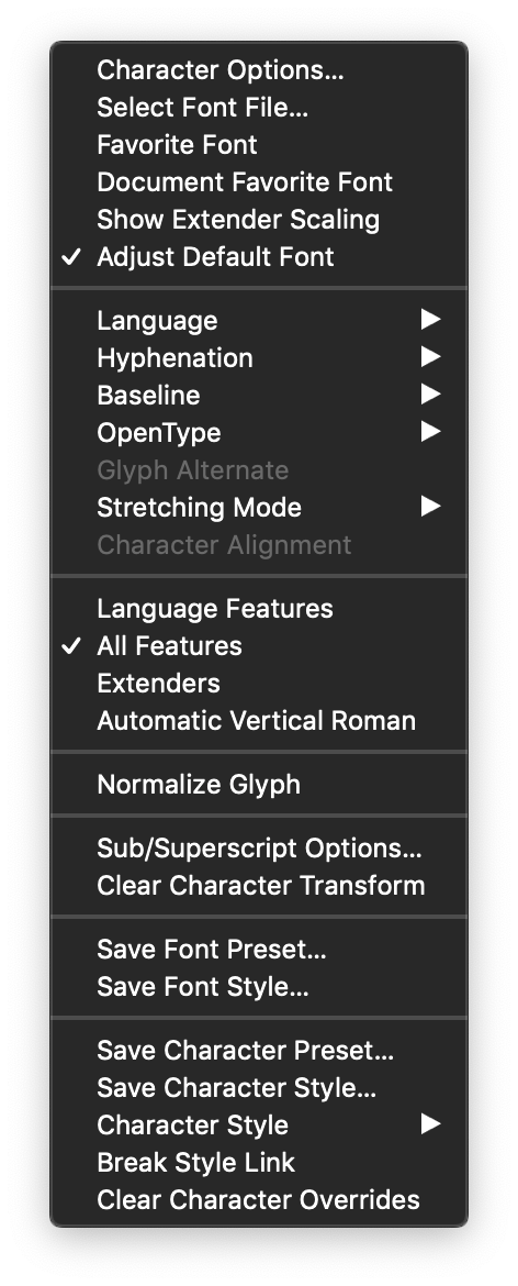 The Character panel menu