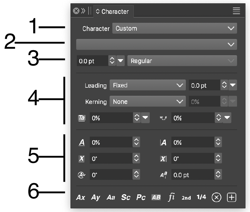 - (1) The Style field opens a menu of character styles and presets. Character options can be saved as a style or a preset, and reused on other text selection. These styles are similar to the well known character style concept.